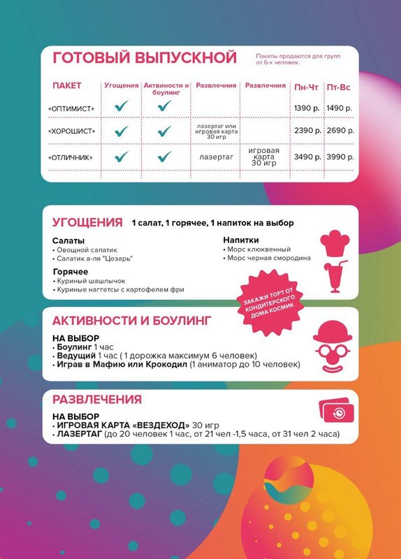 Все хорошо и отлично! Я довольна разнообразием развлечений, а также боулингом, который всем понравился. Как-то отмечали день рождения, заказывали еду, хорошую кухню. Еще воспользовались услугой, когда дети могли сами себе сделать пиццу.
